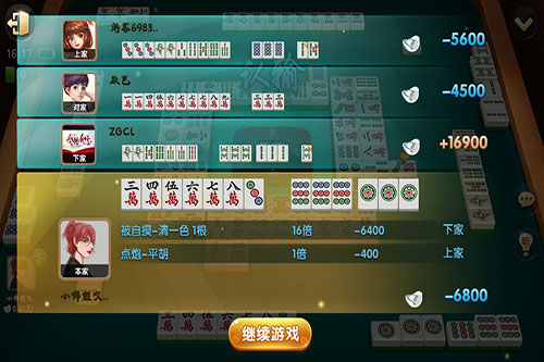 在血流麻将的玩法中,玩家在胡牌之后仍然可以继续进行游戏,如果别的玩家打出的牌还恰好是自己的叫牌,那还能够继续胡牌,甚至在听牌牌型不会发生变化的前提下还能够杠牌。直到牌面上的牌被全部摸完,游戏才算真正结束。