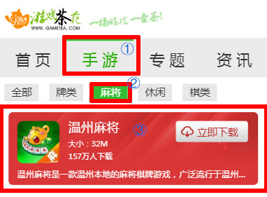 2、选择【手游】栏目,进入后选择【麻将】子类,因为温州麻将属于麻将类游戏。